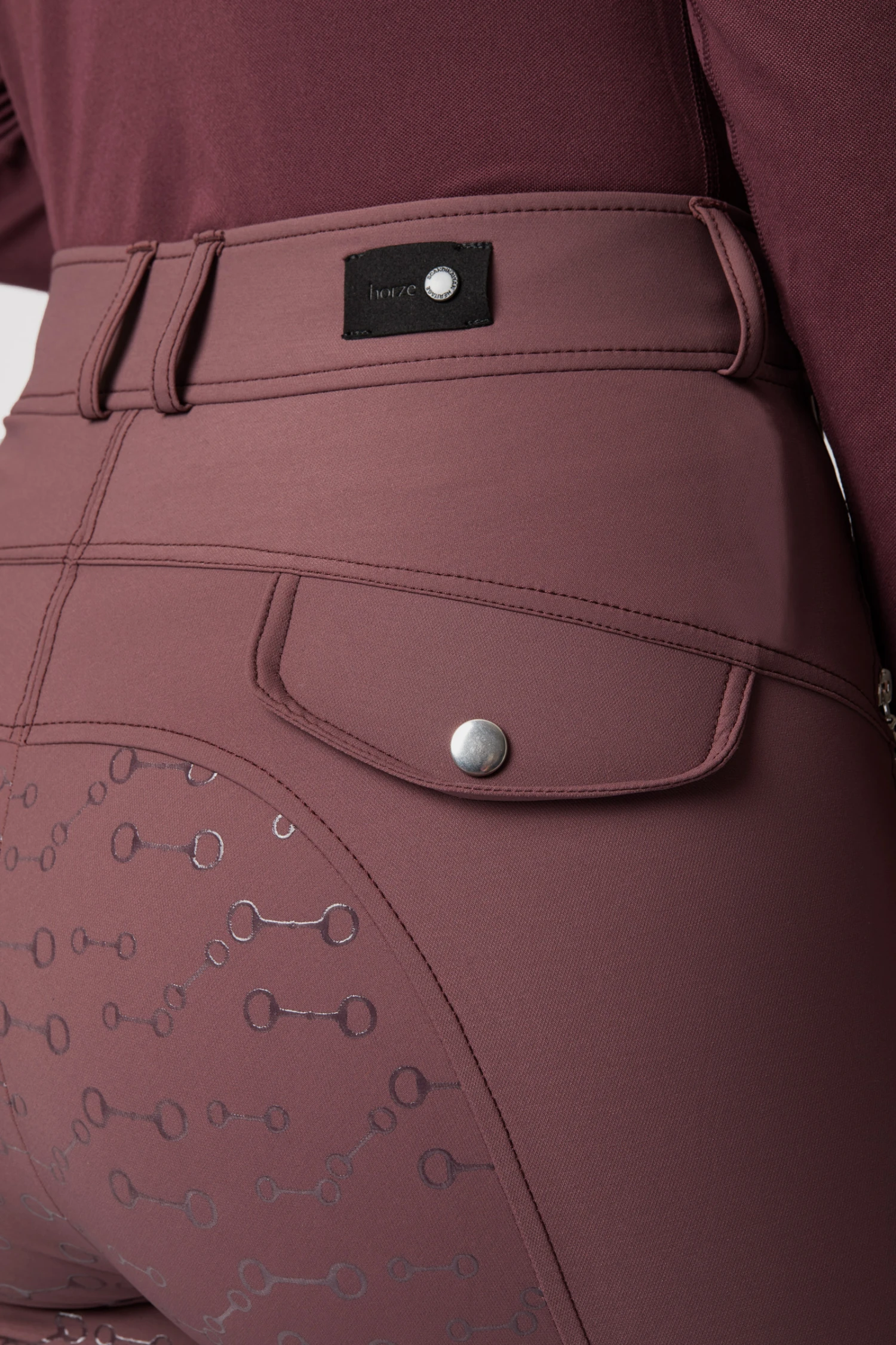 Die Horze Andrea Reithose ist mit schmeichelhaften Nähten auf der Vorderseite versehen, die deine Beine optisch verlängern. Der Bund mit drei Knöpfen ist vorne höher, was ein stilvolles Detail darstellt. Zwei Reißverschlusstaschen bieten Platz für deine Habseligkeiten, und der Silikonvollbesatz hält dich im Sattel.
