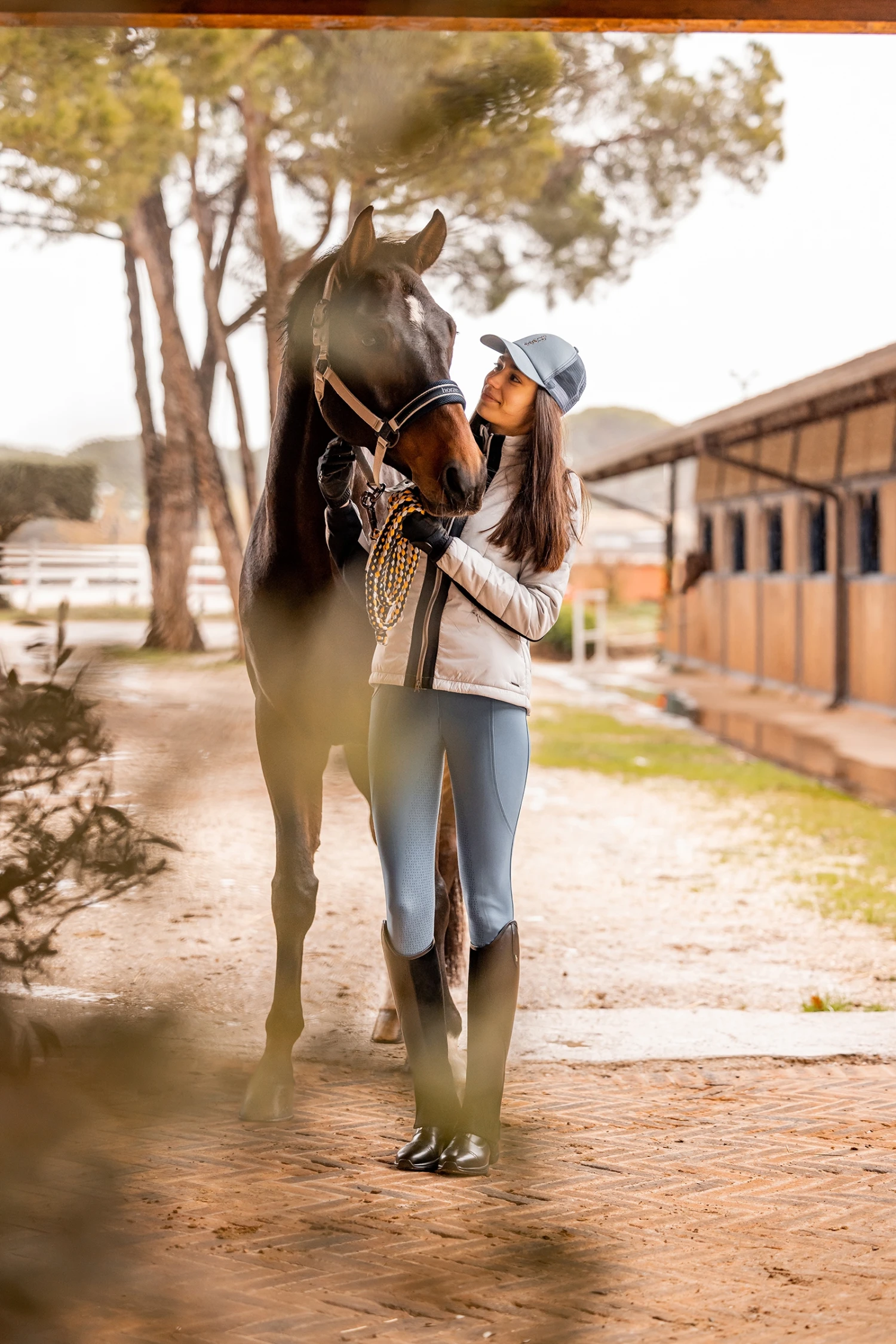 Diese funktionelle Damenjacke ist leicht wattiert, an den Seiten und Ärmeln gesteppt und hat einen einseitigen Stretch-Fleece-Einsatz am Rücken und an den Ärmeln. Kontrastfarbige Paspeln an den Ärmeln und am Reißverschluss. Sie ist wasserabweisend und winddicht und eignet sich perfekt zum Überziehen. 3D-Logoaufdruck auf der Rückseite unterhalb des Nackens und eine kleine Logoplatte aus Metall am vorderen Saum. Zwei versteckte Reißverschlusstaschen bewahren deine Sachen beim Reiten sicher auf. Die rückseitigen Knöpfe öffnen einen Reitschlitz für mehr Bewegungsfreiheit im Sattel.