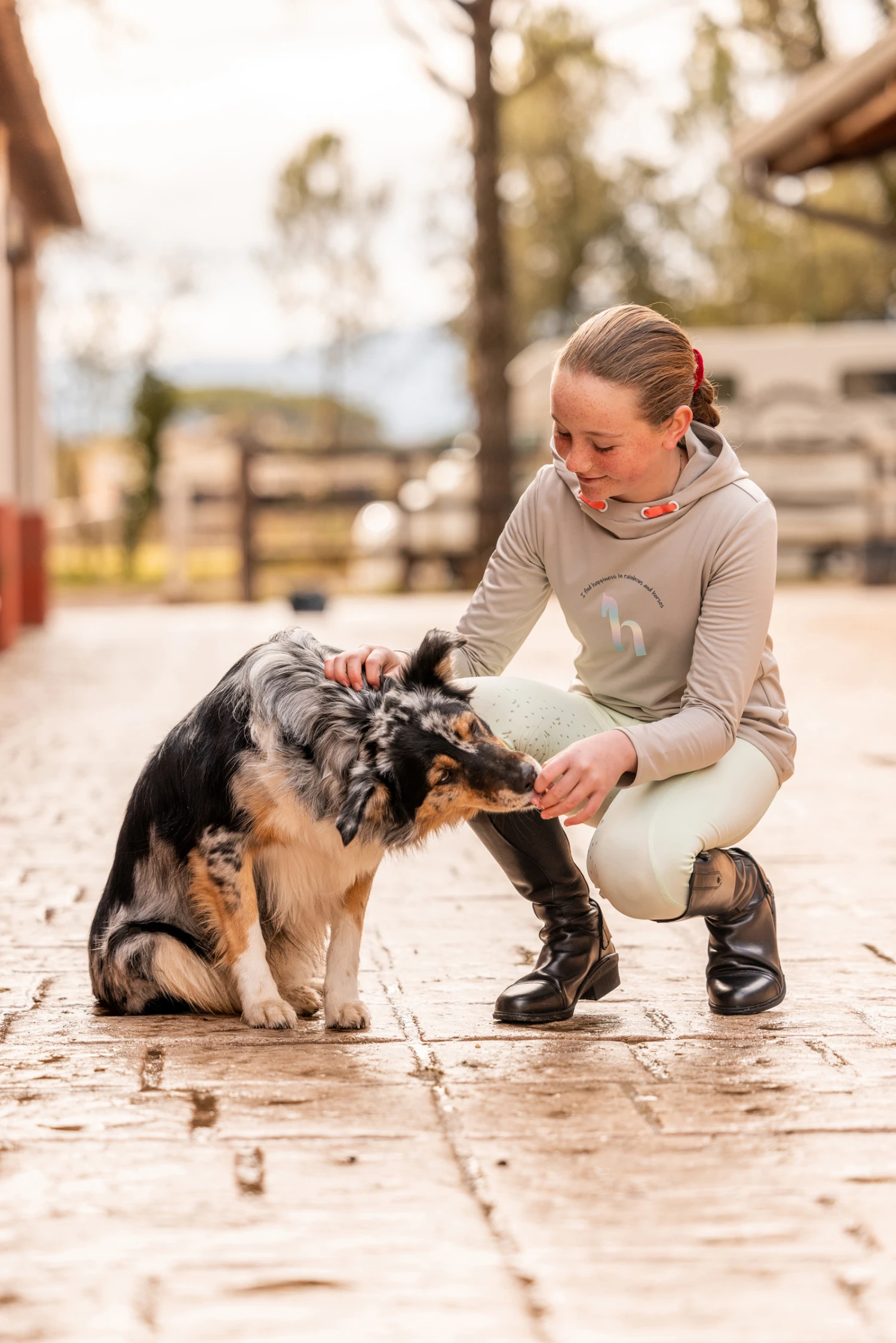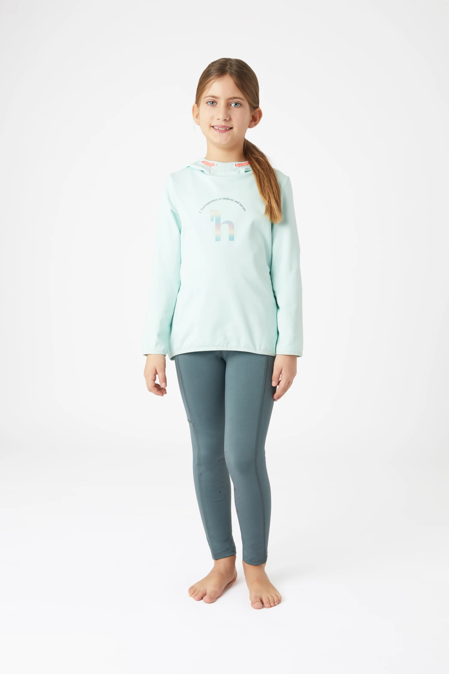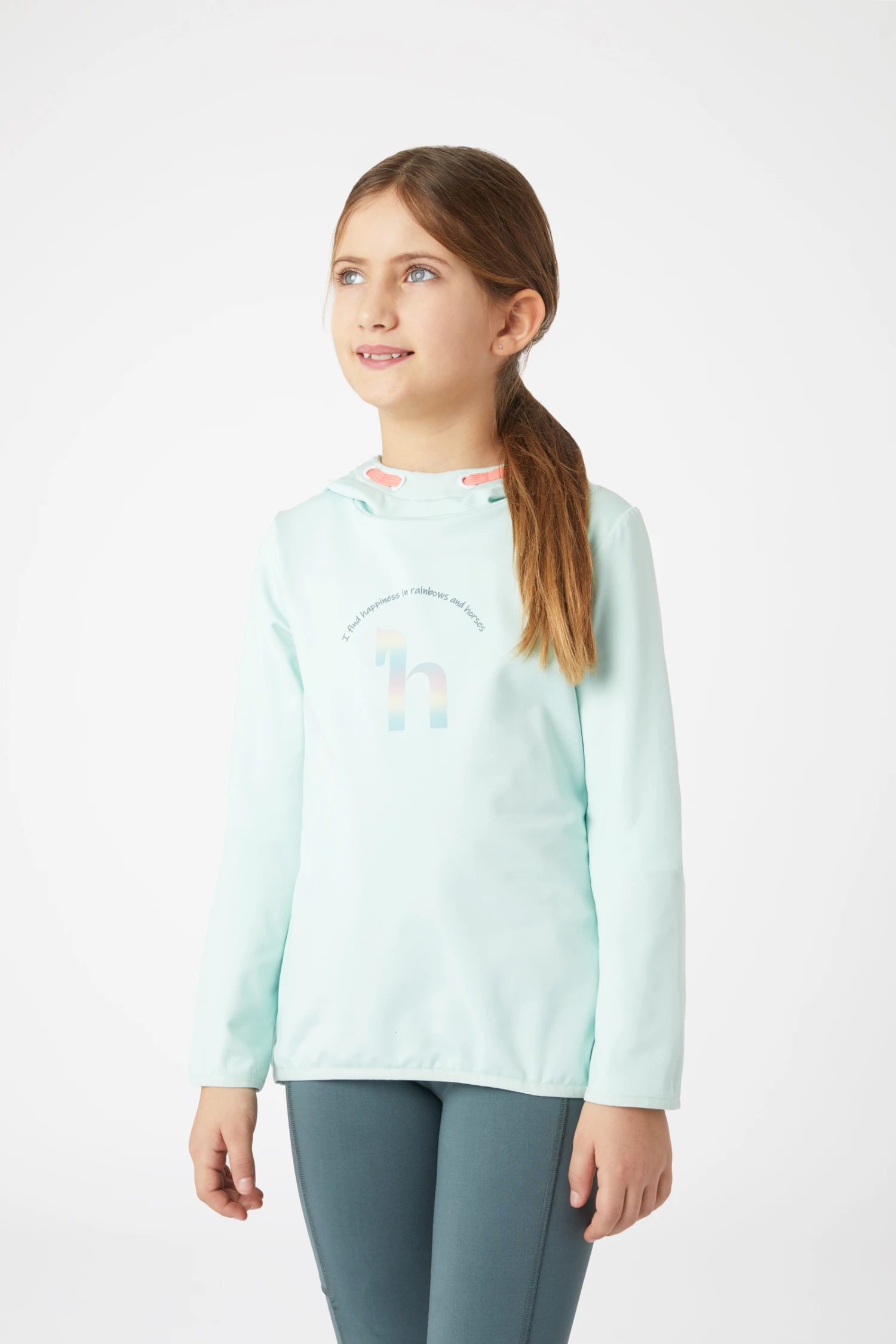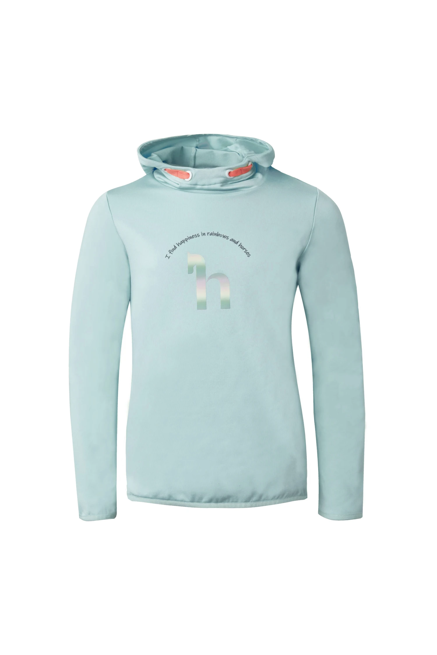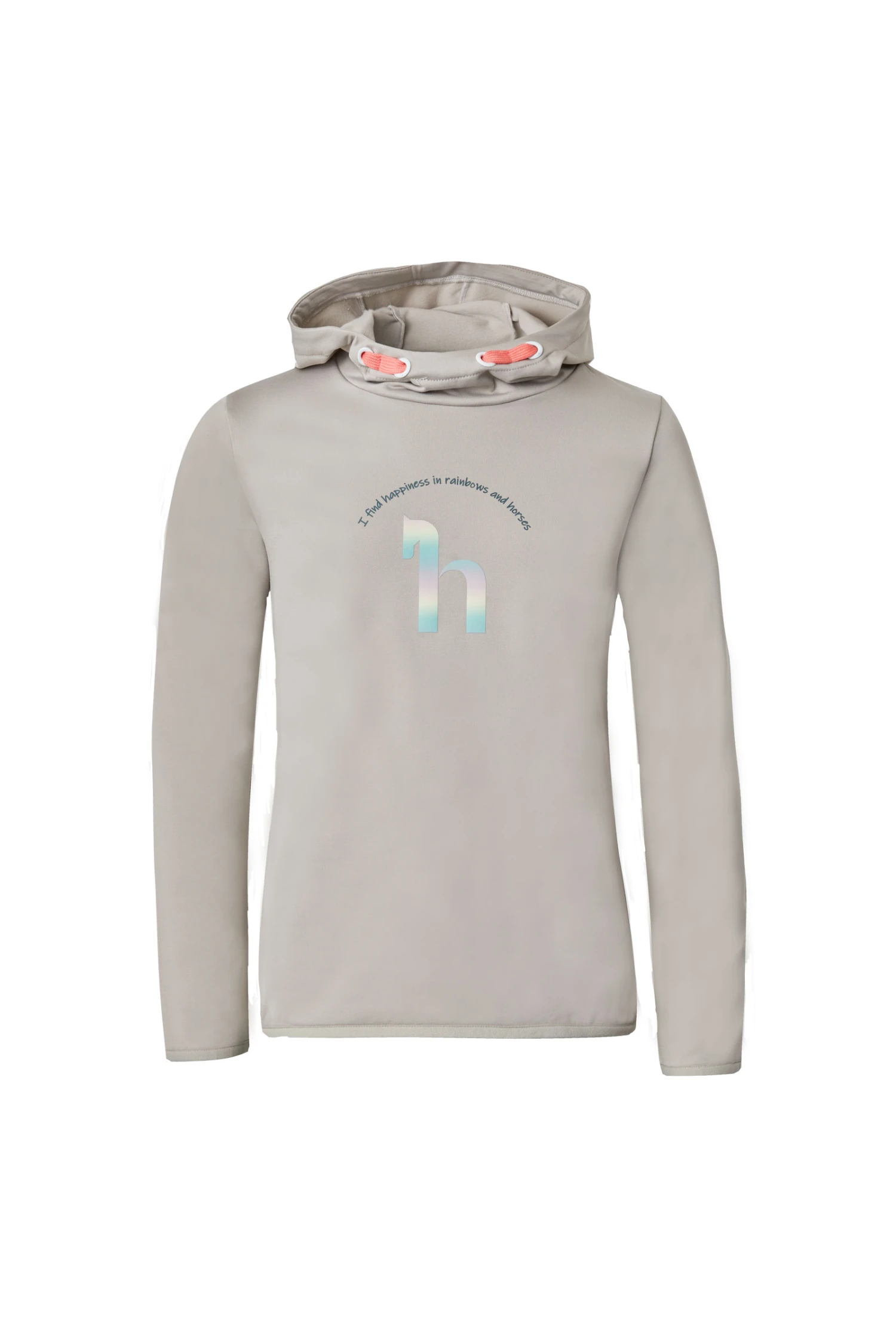 Superbequemer Kapuzenpulli mit glatter Außenseite, damit keine Pferdehaare daran kleben bleiben. Außerdem ist der Stoff atmungsaktiv und trocknet schnell. Auf der Vorderseite befindet sich ein großes holografisches „h“-Logo mit der Aufschrift „I find happiness in horses and rainbows“ darüber. Kordeln in Kontrastfarbe sorgen für einen farbenfrohen Touch, während elastische Bündchen an Saum und Ärmeln die Passform und den Komfort dieses Hoodies verbessern.