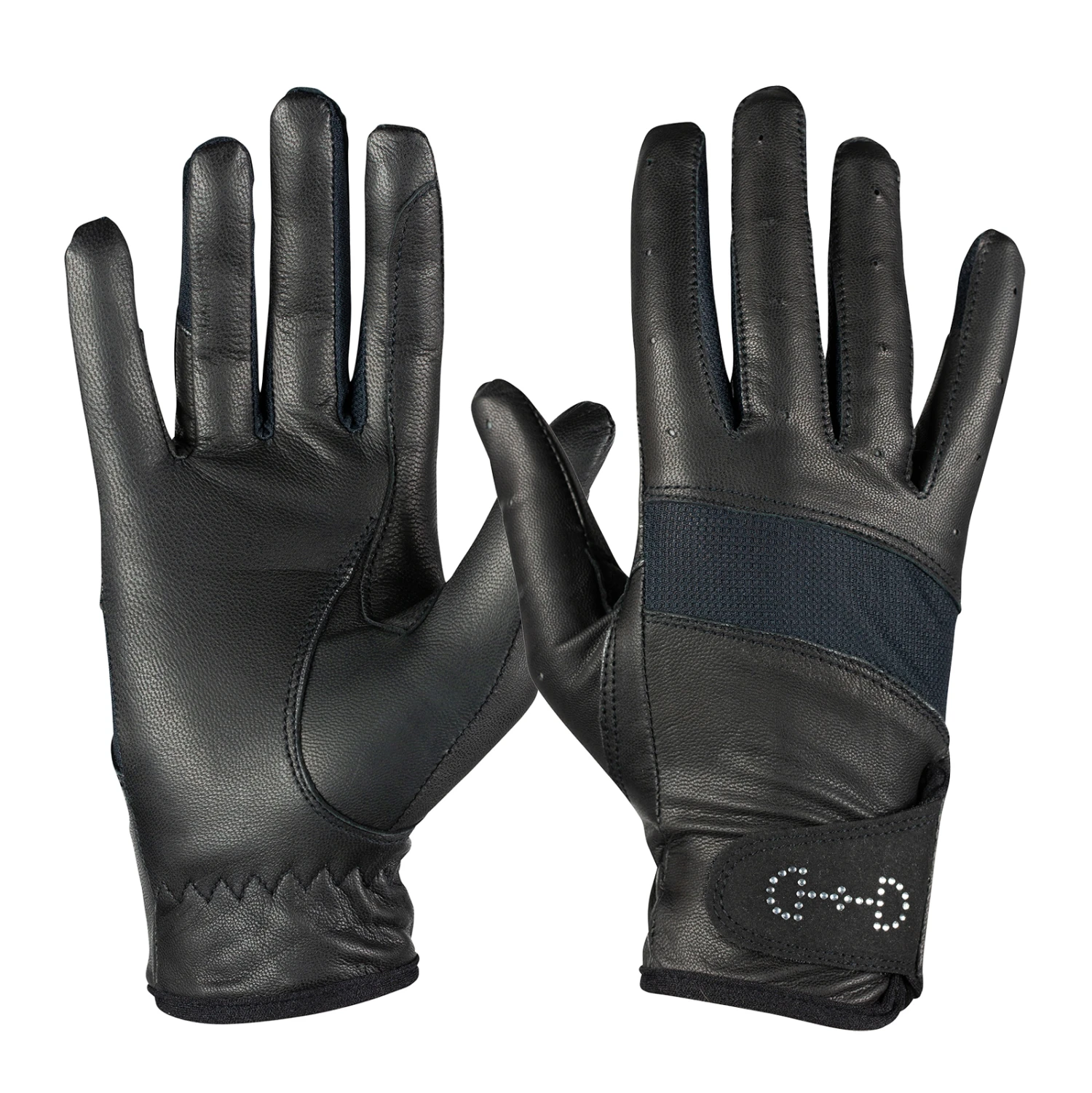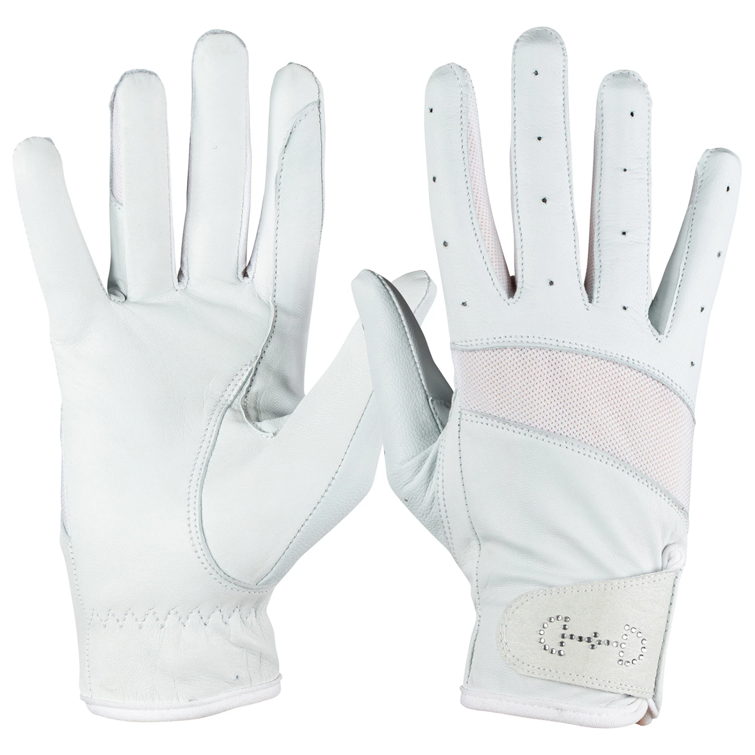 Eine winzige D-Ring-Trense mit Kristallen wird an der hinteren Manschette dieser schönen Mesh-Handschuhe für eine feminine Note hinzugefügt. Das Leder verfügt über eine Netzrückseite zur Belüftung an heißen Sommertagen. Diese Handschuhe passen sich Ihren Händen an und bieten guten Halt beim Reiten.