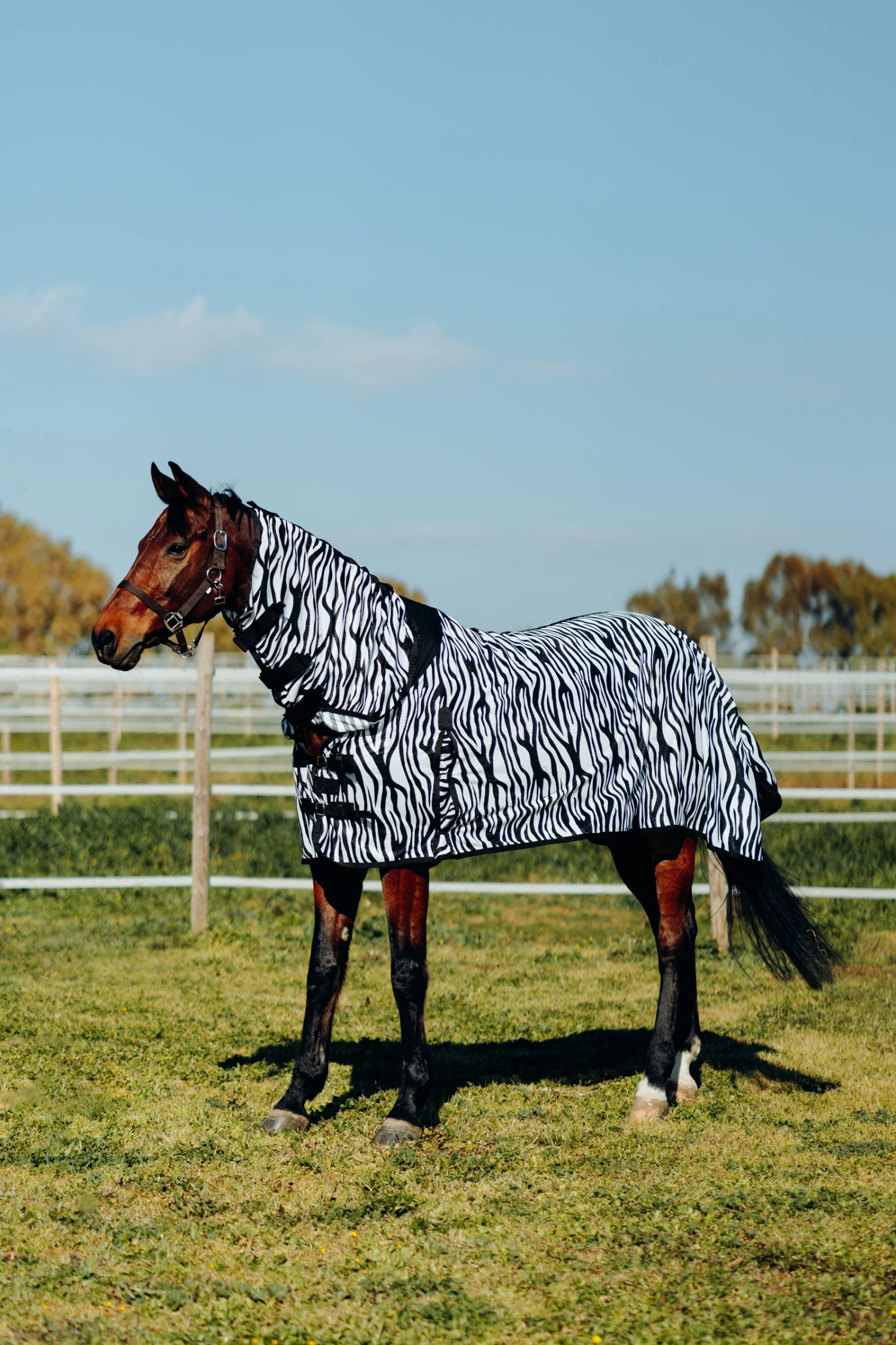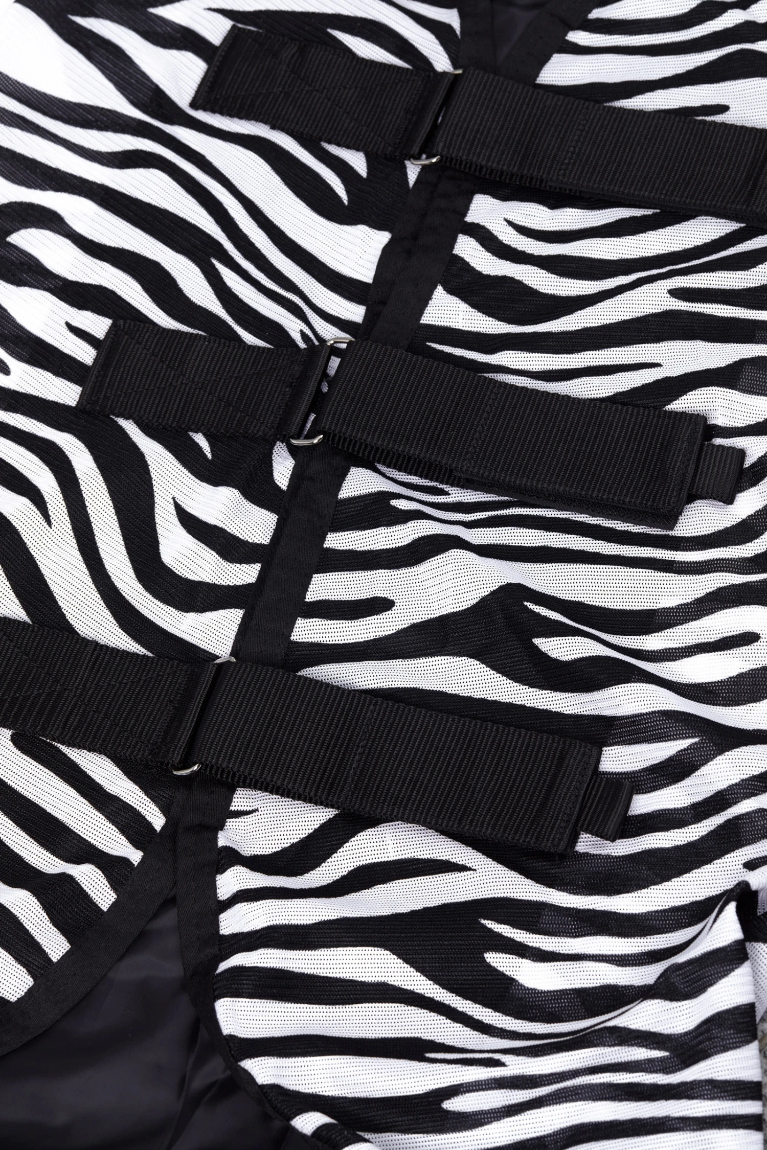 Die Horze Defender Fliegendecke schützt dein Pferd in Sommer von Hals bis Schweif vor Insekten. Elastik zwischen Decke und Halsteil sorgt für Komfort. Das Halsteil kann mit einem Klettverschluss fixiert werden und bietet die Option für eine Fliegenmaske. Hohe Gehfalten schränken die Bewegungsfreiheit deines Pferdes nicht ein. Frontverschlüsse, Kreuzgurte und Schreifriemen halten die Decke an ihrem Platz.