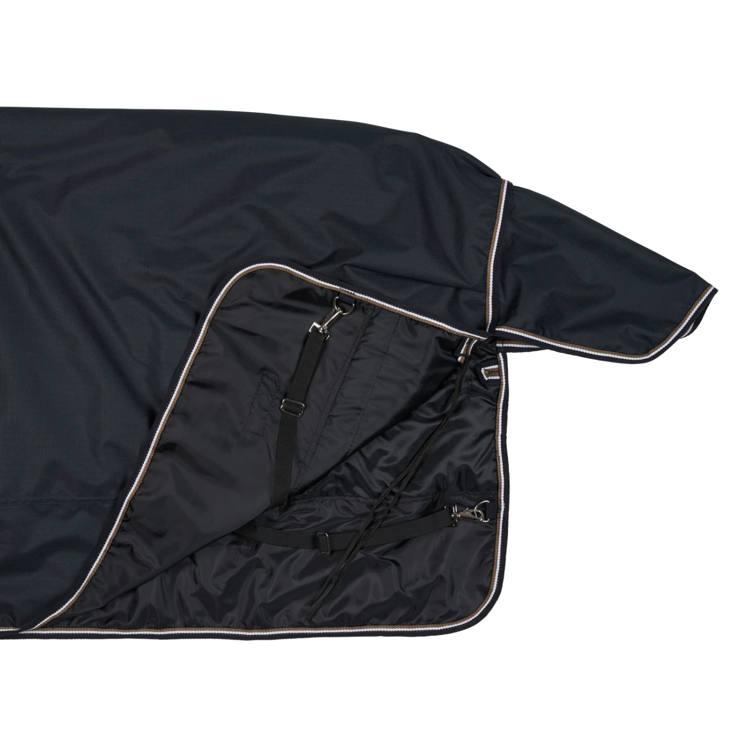 Diese Decke mit Halsteil besteht aus wasserdichtem, atmungsaktivem Material. Die gute Passform an Hals und Schultern macht sie bequem und die hohe Gehfalte sorgt für Bewegungsfreiheit. Frontverschlüsse, Kreuzgurte, Beinschnüre und Schweiflatz sichern die Decke und bieten vollen Schutz.
