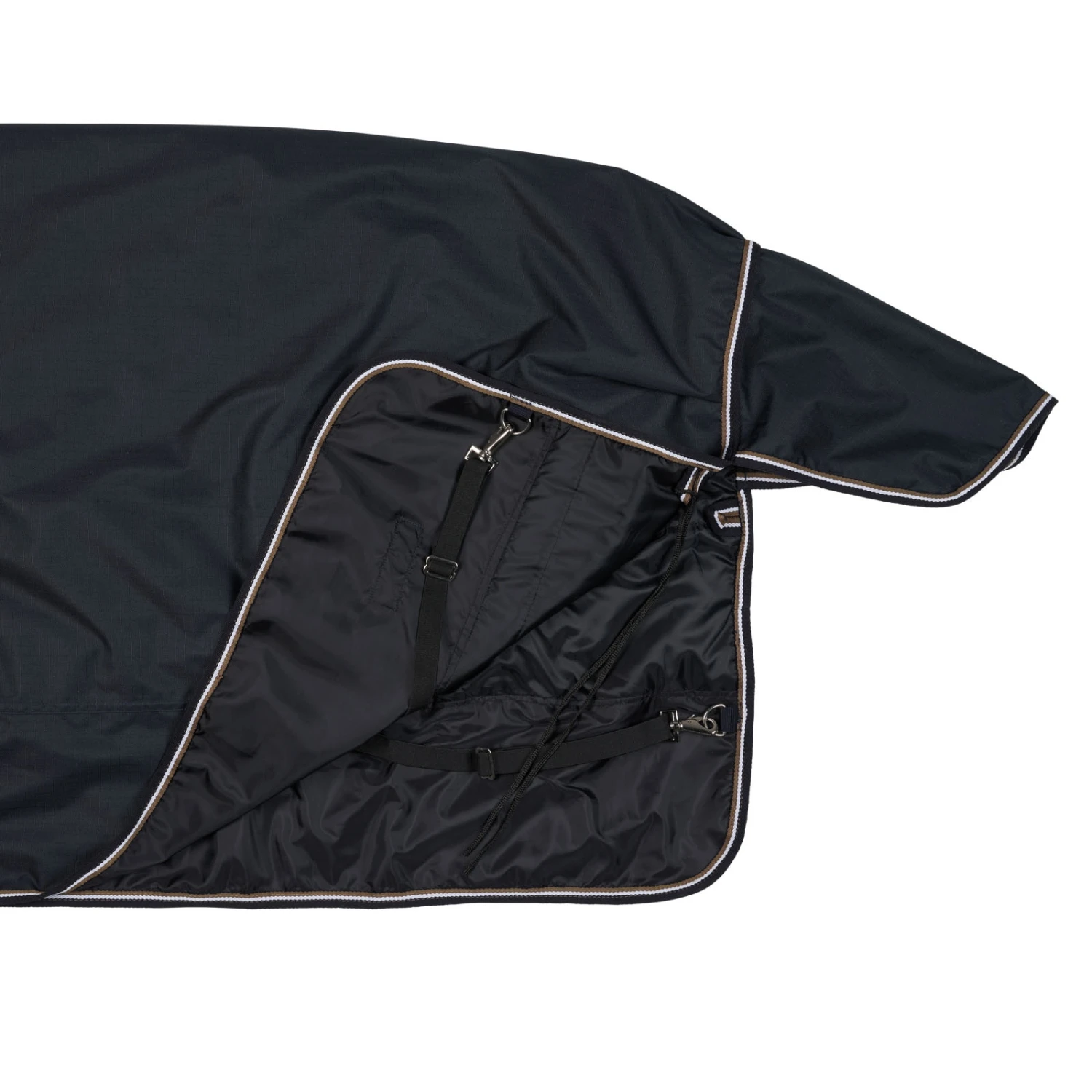 Diese Decke mit Halsteil besteht aus wasserdichtem, atmungsaktivem Material. Die gute Passform an Hals und Schultern macht sie bequem und die hohe Gehfalte sorgt für Bewegungsfreiheit. Frontverschlüsse, Kreuzgurte, Beinschnüre und Schweiflatz sichern die Decke und bieten vollen Schutz.