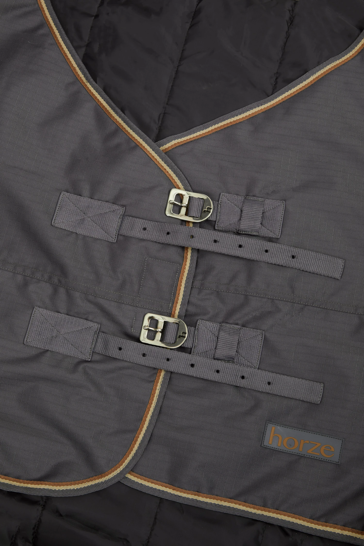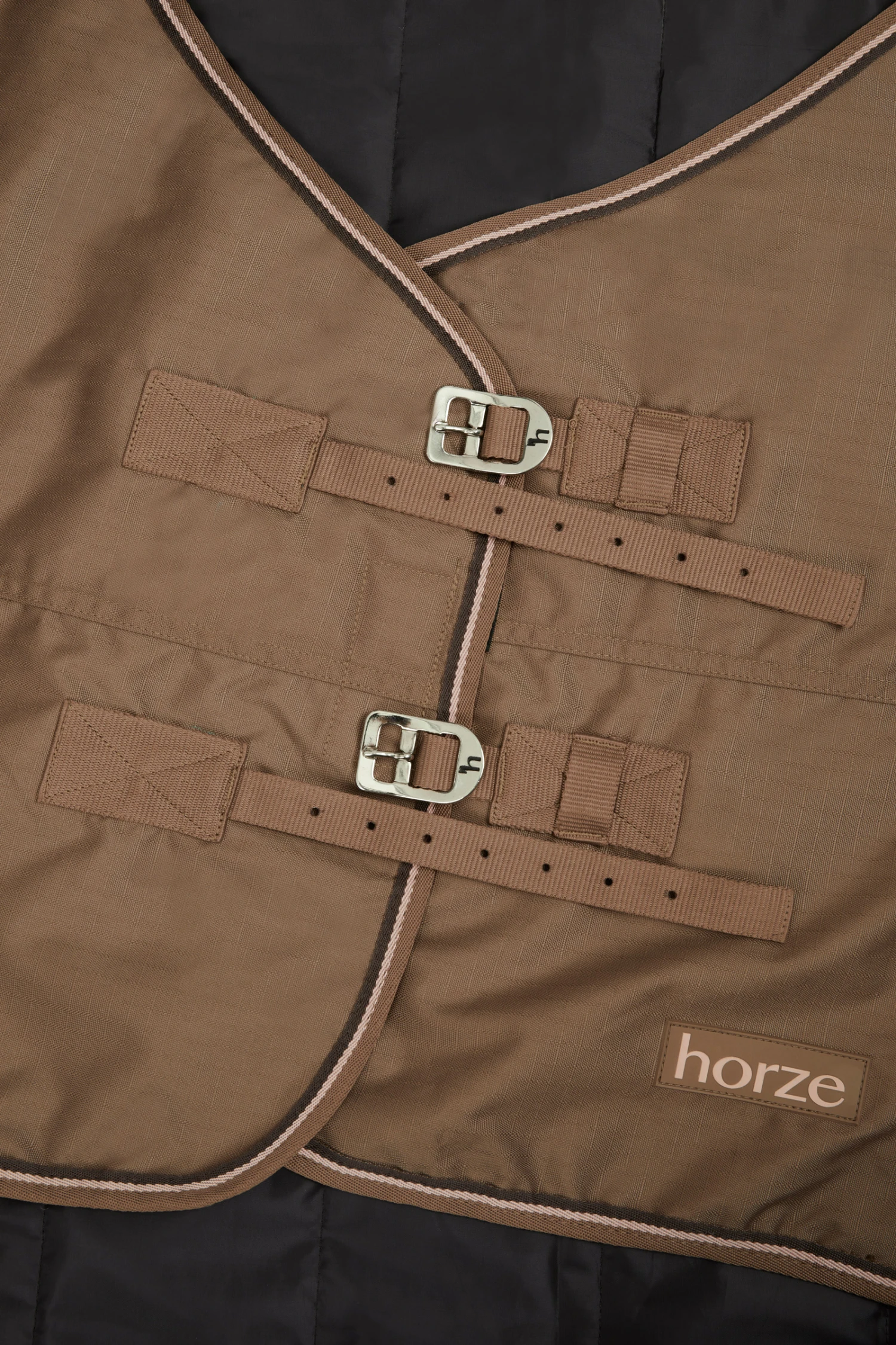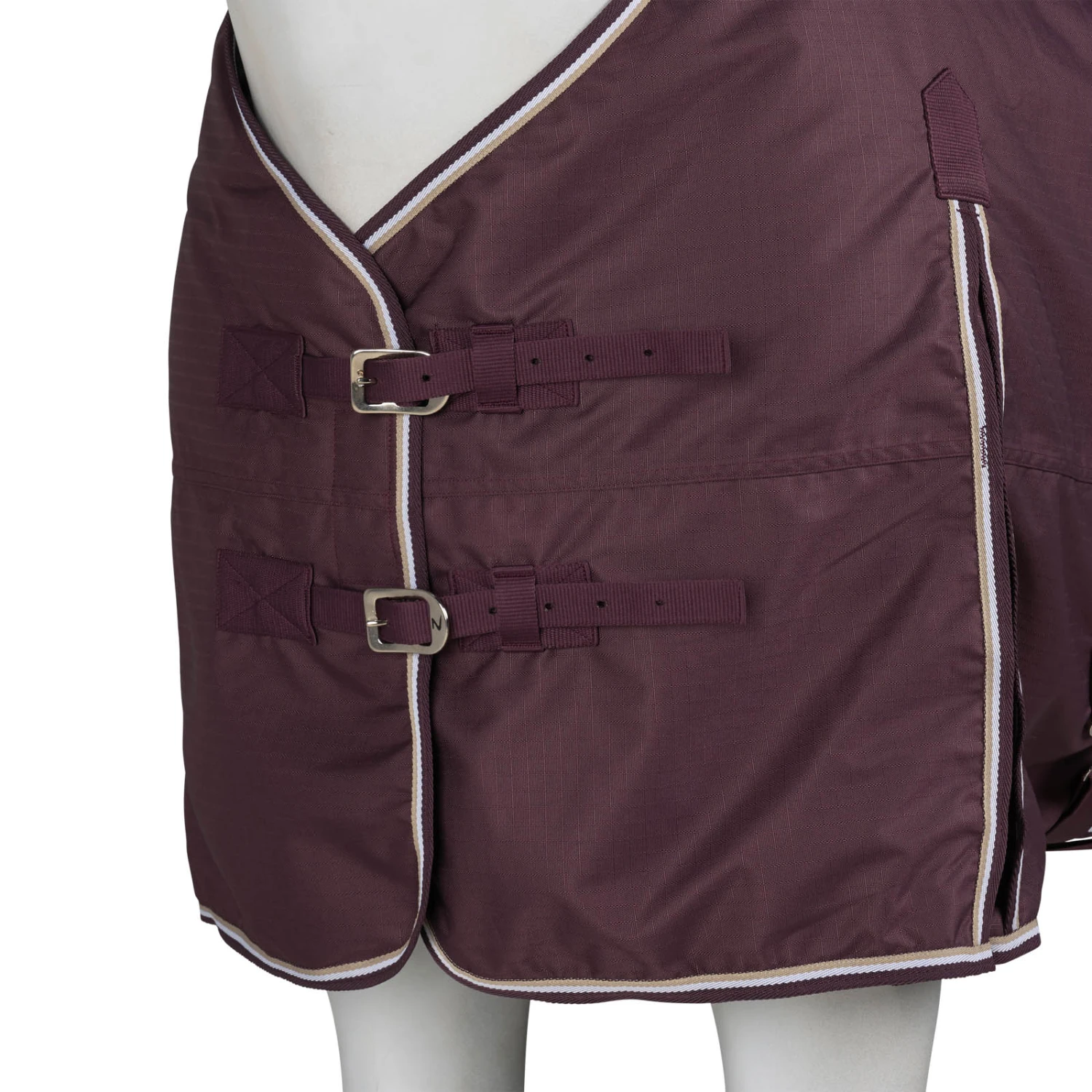 Diese Decke ist aus wasserdichtem, atmungsaktivem Material gefertigt. Der gute Sitz an Hals und Schultern macht sie bequem und die hohen Gehfalten bieten Bewegungsfreiheit, damit sich dein Pferd austoben kann und nicht eingeschränkt wird. Frontverschlüsse, Kreuzgurte und Beinschnüre halten die Decke sicher an ihrem Platz und verhindern Verrutschen.