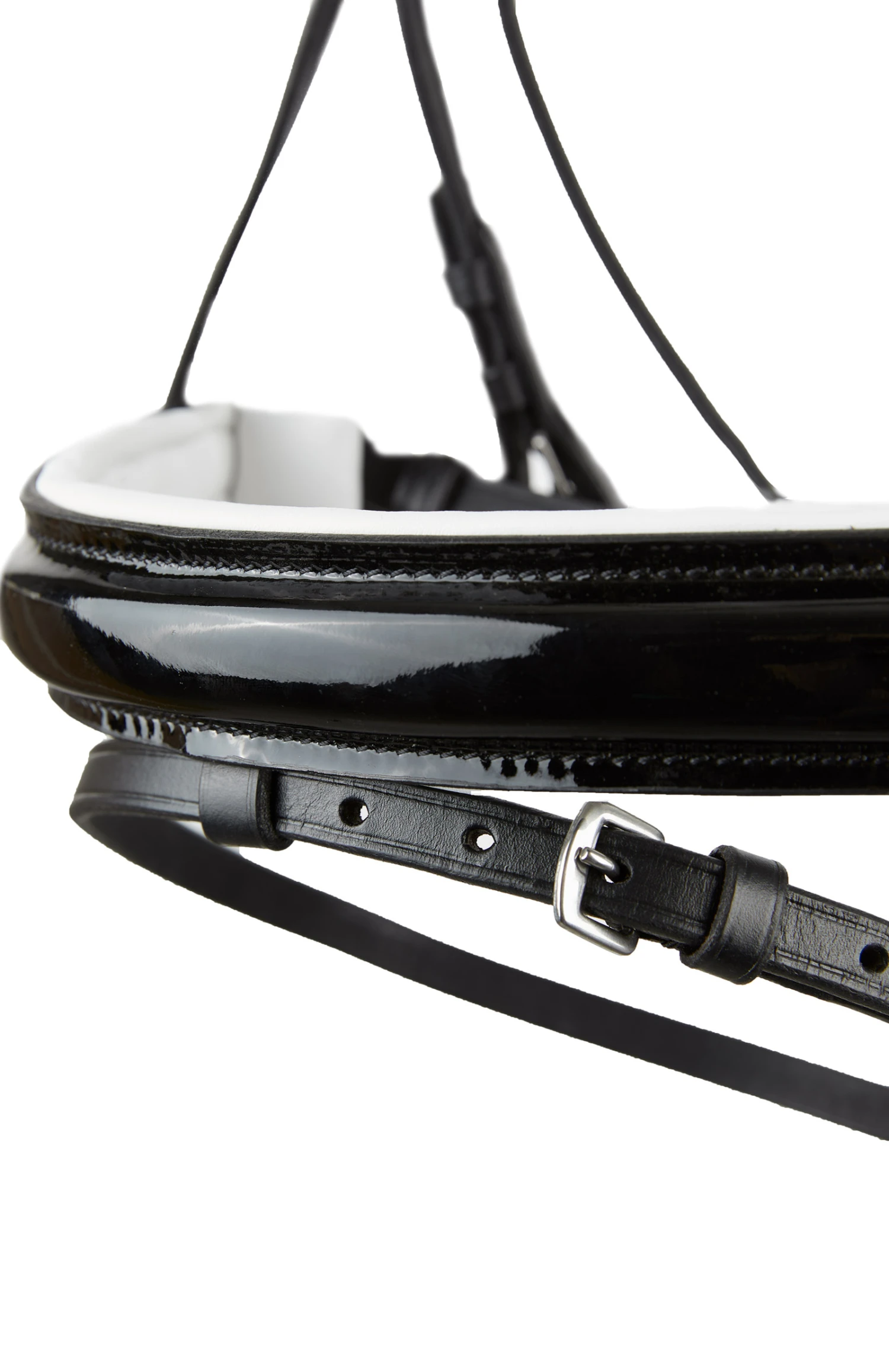 Das unterlegte Zaumzeug für die Dressur sieht wunderschön aus und passt perfekt. Die weiche Polsterung mit anatomisch geformten Ausschnitten für die Ohren sorgt für Komfort und eine bessere Passform. Die gepolsterte Umlenkverschnallung ist einfach zu handhaben. Der schöne V-förmige Stirnriemen mit einer glänzenden Reihe Strasssteine sorgt für ein wenig Glitzer.