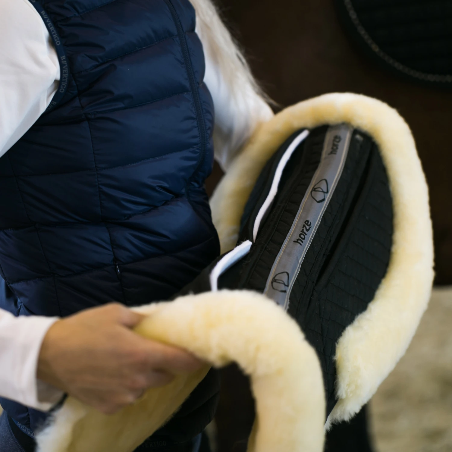 Das korrigierende Ausgleichs-Pad harmoniert mit dem gepolsterten Lammfell-Komfort und passt zu jedem Sattel.