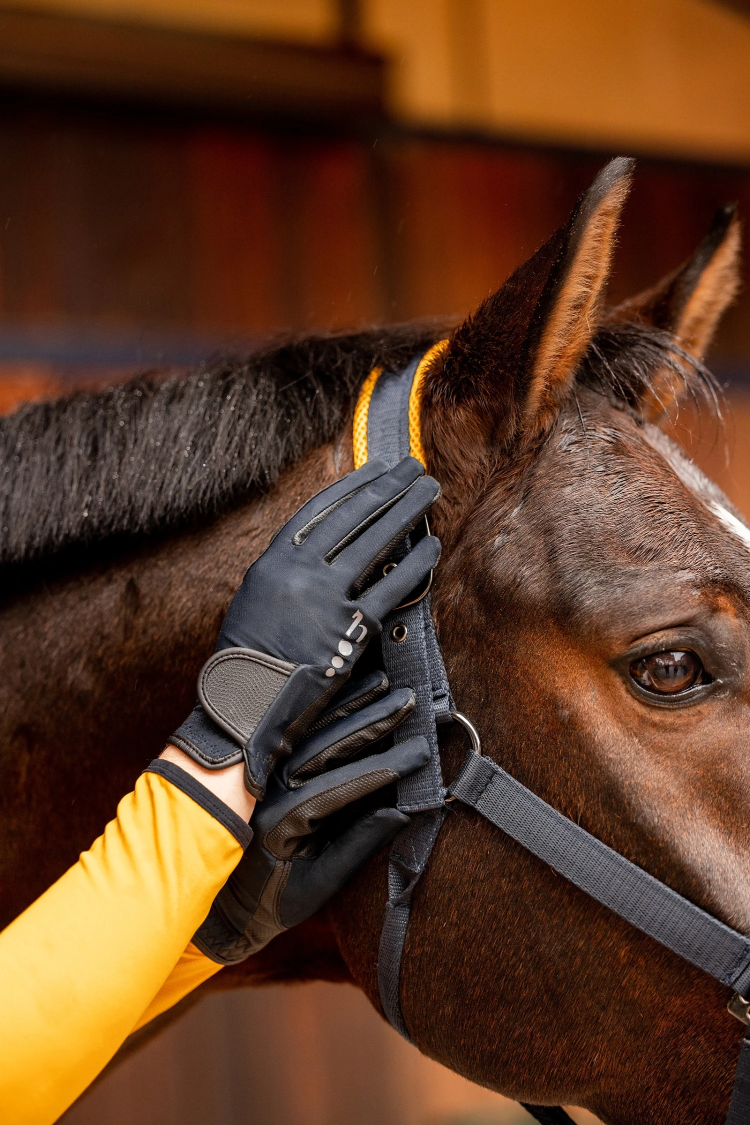 Bequemer Allrounder mit dehnbarem Oberhandgewebe und Serino auf der Handfläche. Verstärkungen an den Zügeln. Elastische Bündchen am Handgelenk für einen bequemen Sitz, klassischer Klettverschluss und sportliches „h“-Logo auf der rechten Seite.