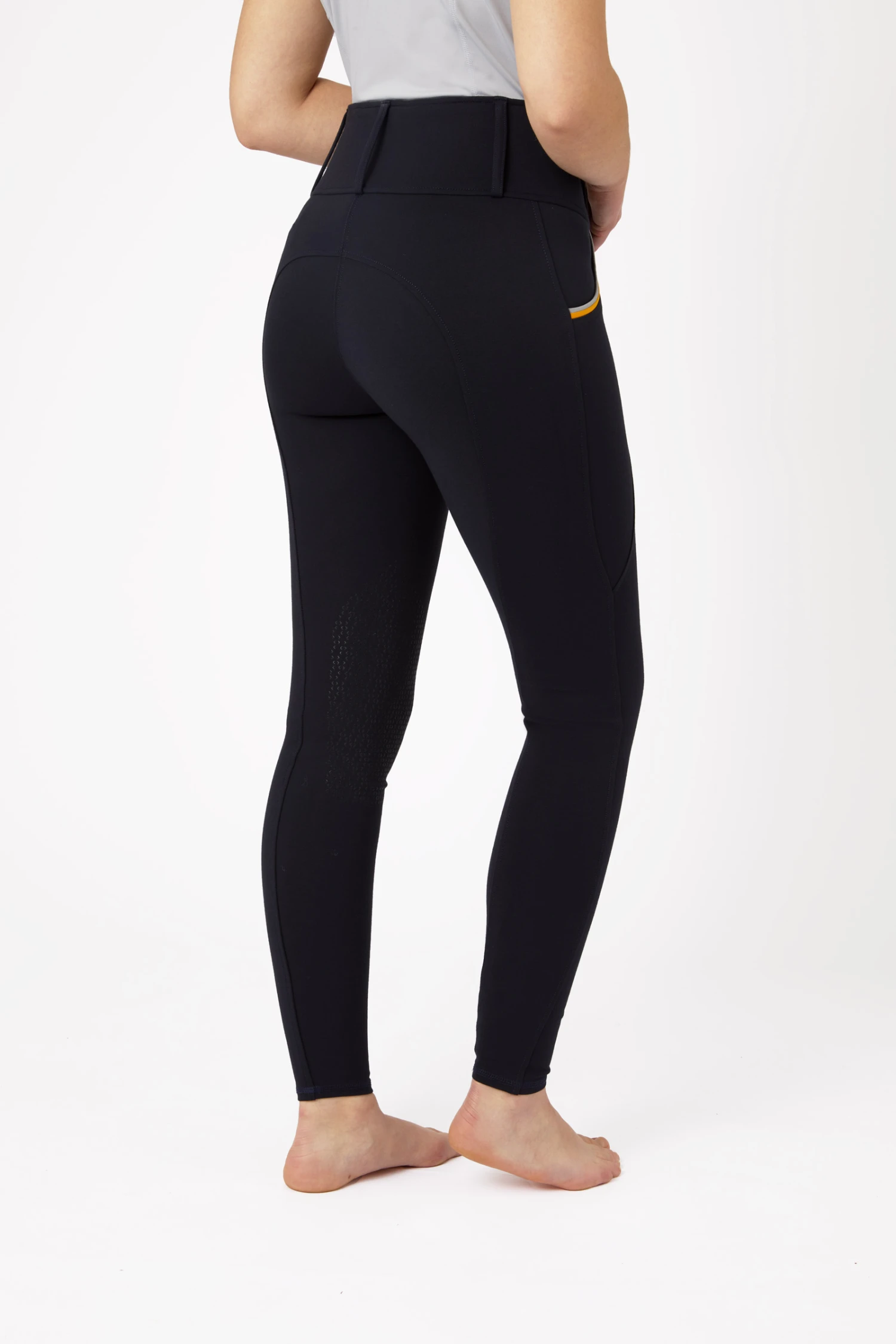 Große Taschen auf der Vorderseite jedes Oberschenkels sorgen dafür, dass dein Handy beim Reiten nicht im Weg ist. Die Taschen sind mit einer bunten Paspel versehen und ein echter Hingucker auf der sonst schlichten Tights. Das elastische Material und der breite Bund machen sie super bequem zu tragen. Dank der Gürtelschlaufen kannst du für mehr Stil auch einen Gürtel anbringen. Ein kleiner Logoanhänger befindet sich unter dem vorderen Bund.