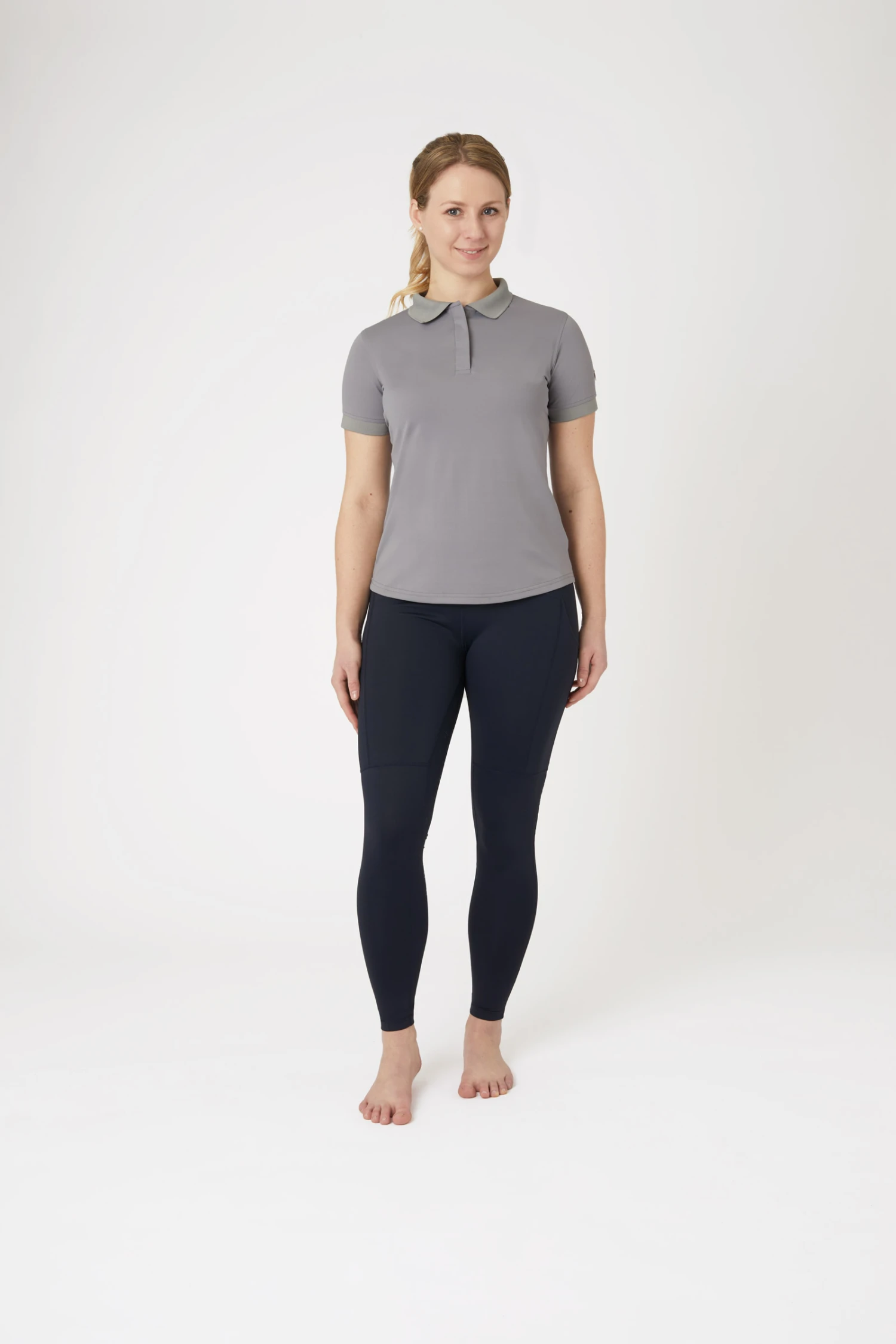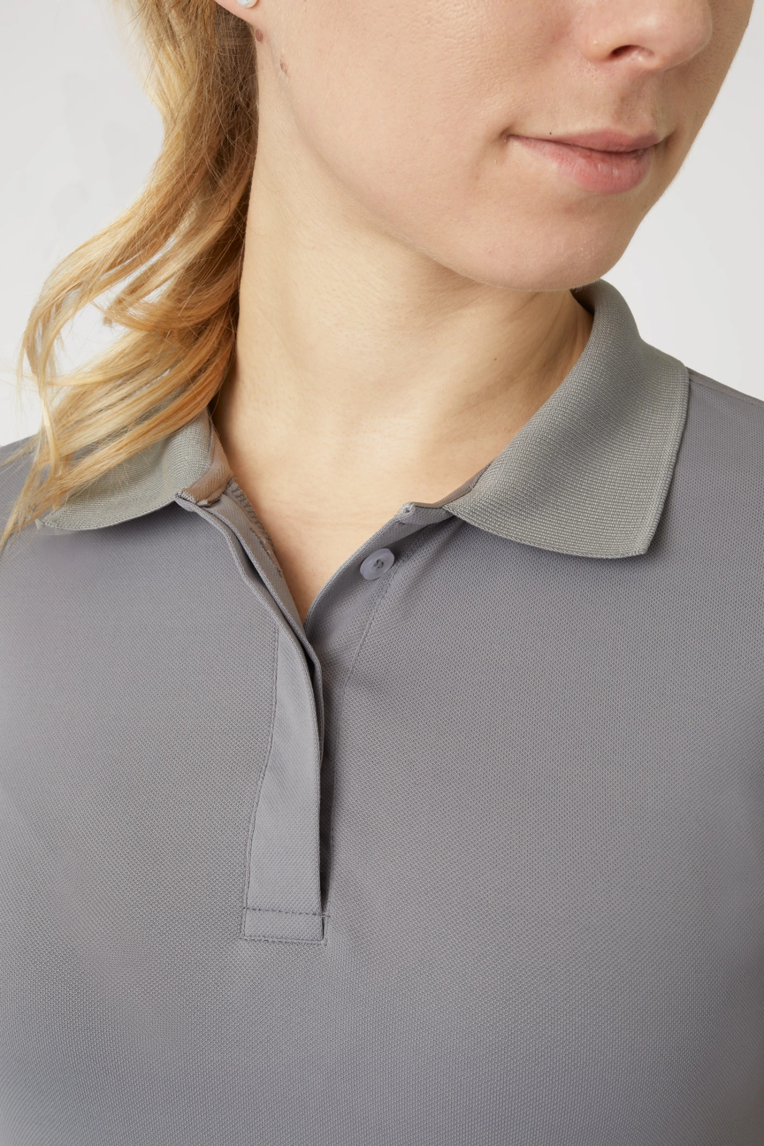Dank des atmungsaktiven, feuchtigkeitstransportierenden Gewebes hält dich dieses klassische Damen-Polo auch an wärmeren Tagen angenehm kühl. Außerdem ist das Shirt antibakteriell und bietet UV-Schutz, was es zur perfekten Wahl für schweißtreibende Ritte an heißen Sommertagen macht. Die Vorderseite lässt sich mit einer Reihe versteckter Kunststoffknöpfe öffnen, die ein einfaches An- und Ausziehen ermöglichen, ohne den Style zu stören.