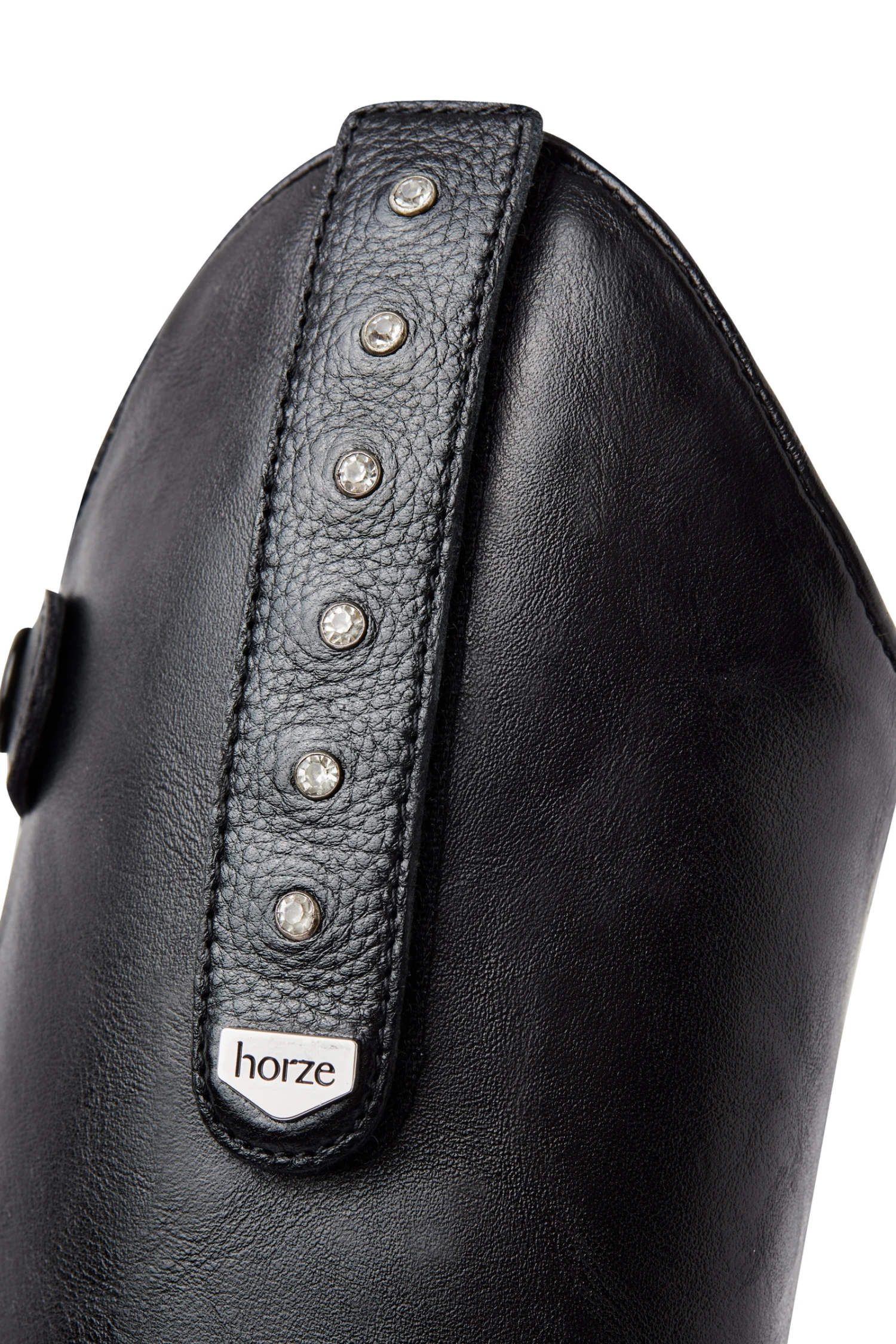 - Horze-Logo aus Metall auf dem Stiefelriemen