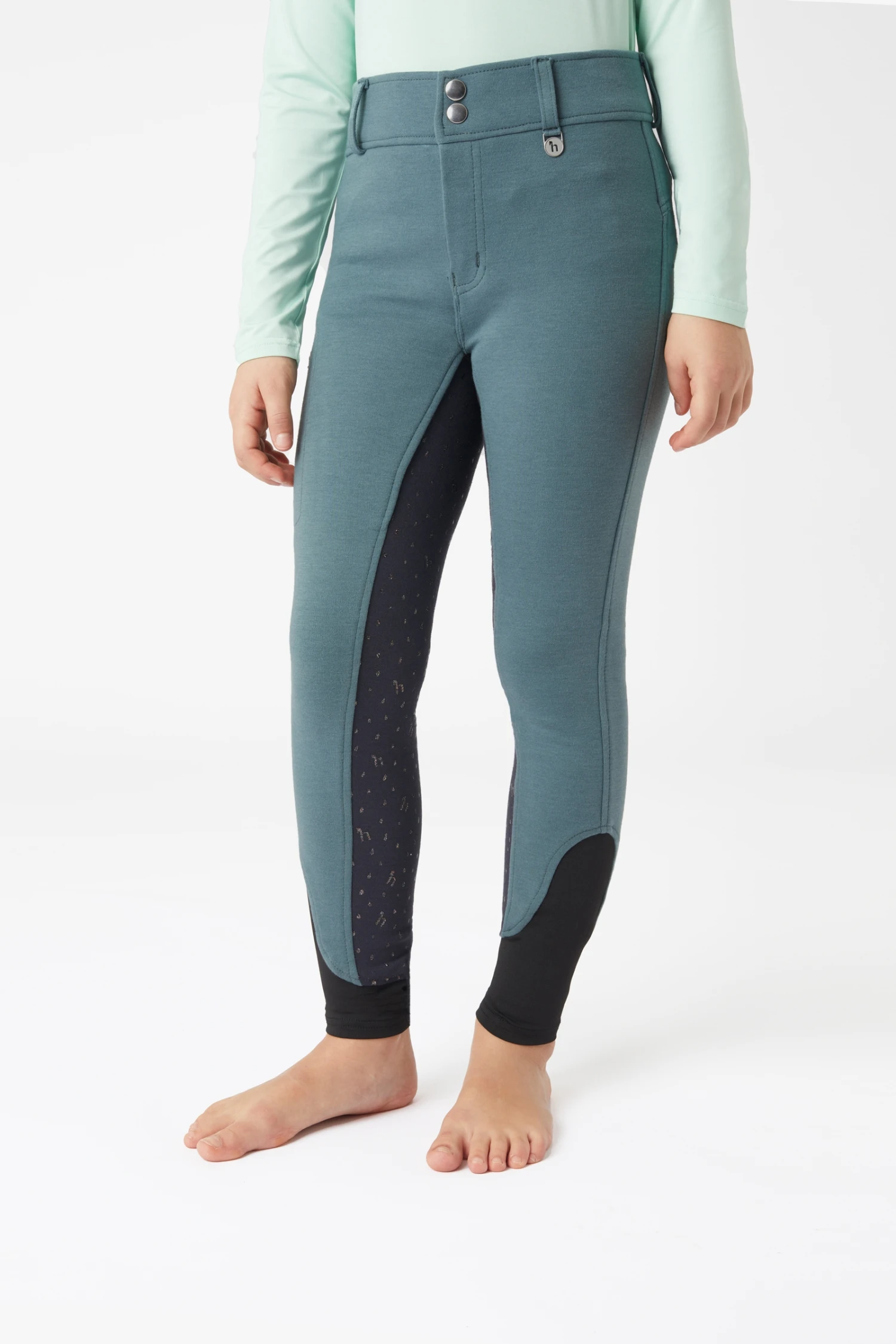 Die perfekte Reithose für junge Mädchen, die sich gerne farbenfroh kleiden. Der Silikonvollgrip in pastelligen Regenbogenfarben hat die Form von Regentropfen und kleinen ‚h‘-Logos. Unterhalb des hinteren Bunds ist eine zarte Regenbogenstickerei angebracht. Elastische Beinbündchen sorgen für mehr Tragekomfort und weniger Volumen unter den Stiefeln. Dank der Gürtelschlaufen kann die Reithose mit einem Gürtel deiner Wahl getragen werden. Eine Reißverschlusstasche am rechten Oberschenkel bietet genügend Platz für das Handy.