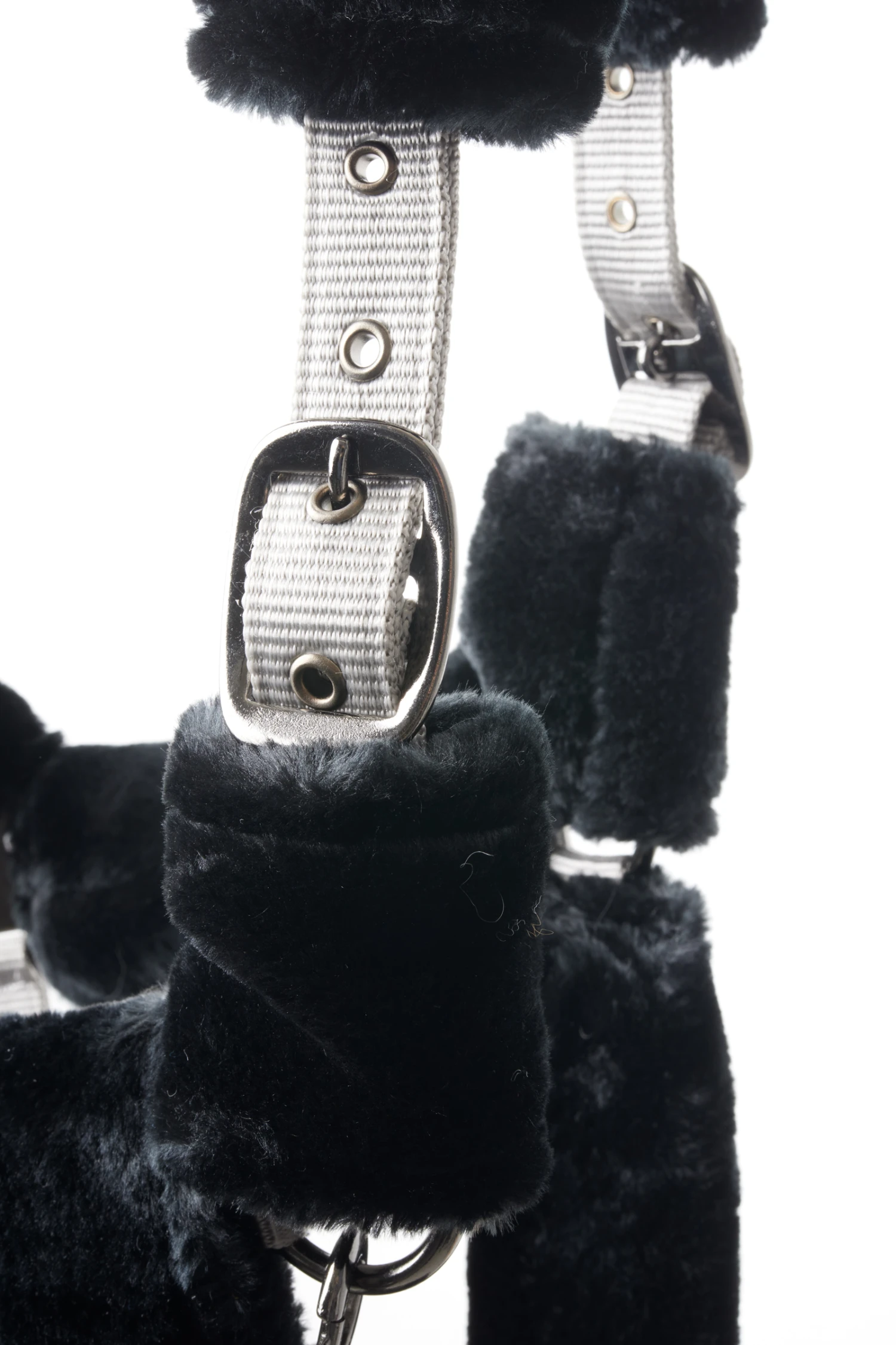 Starkes Gurtband, das mit weichem, flauschigem Kunstfell überzogen ist, sorgt für ein haltbares Halfter, das keine Scheuerstellen verursacht. Beschläge in Gunmetal-Optik sorgen für einen eleganten Look. Passende Führstricke mit Panikhaken (#22696) oder Karabiner (#22697) sind erhältlich.