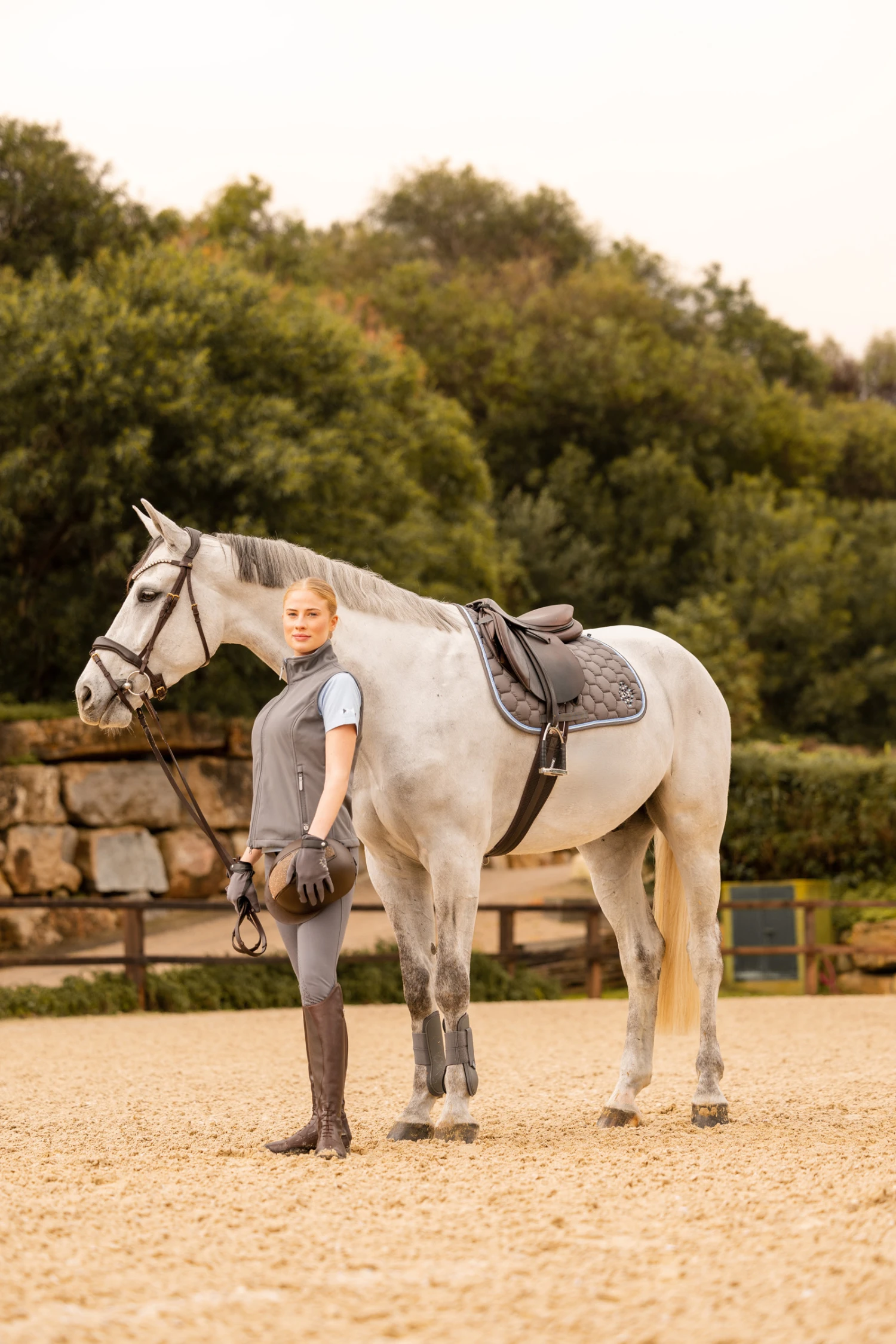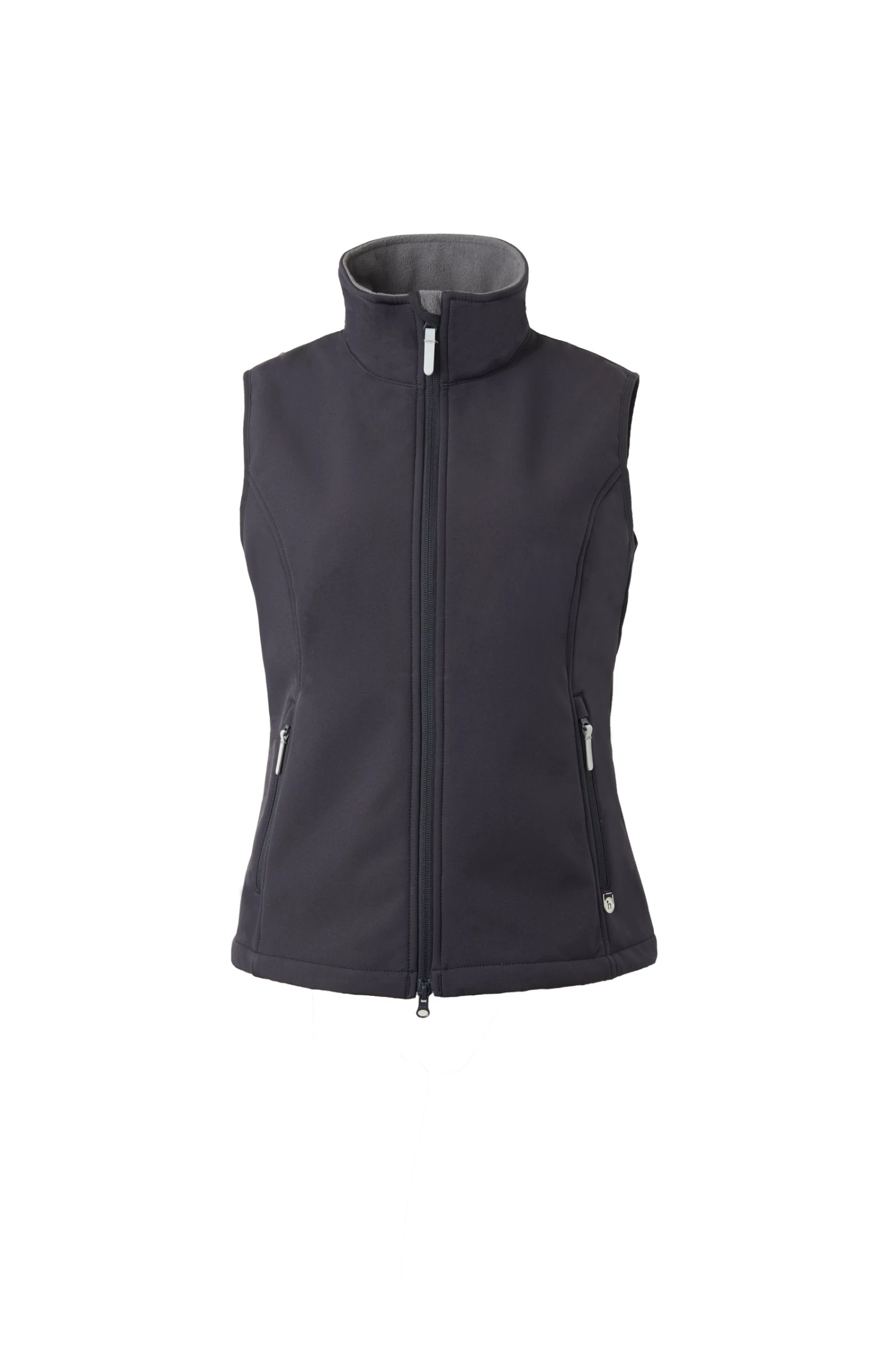 Diese funktionelle Softshell-Weste für Damen mit einem weichen Fleece-Futter in Kontrastfarbe ist die perfekte Wahl für den Lagenlook oder für wärmere Frühlingstage. Das wasserabweisende Material und der leichte Stehkragen sind bei weniger schönem Wetter sehr praktisch. Der Zwei-Wege-Frontreißverschluss macht die Jacke perfekt für das Reiten und die geräumigen Reißverschlusstaschen ermöglichen es dir, Schlüssel oder dein Handy zu verstauen, während du im Stall bist. Der Kordelzug im hinteren Taillenbereich sorgt für eine schmeichelhafte Figur, wenn er angezogen wird.