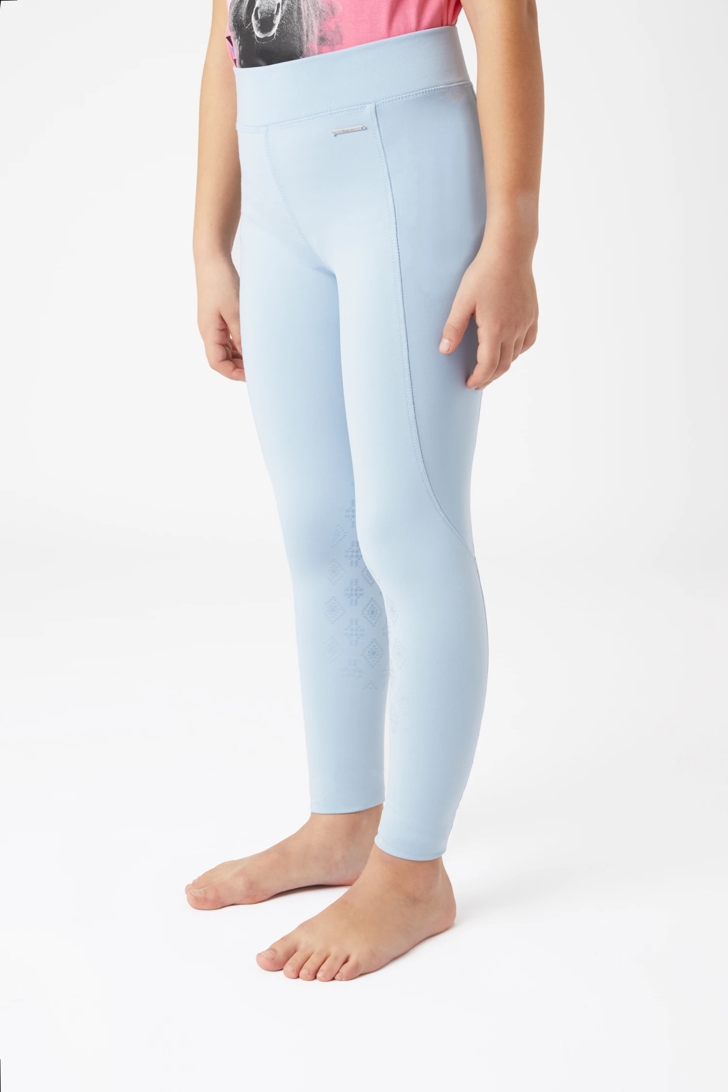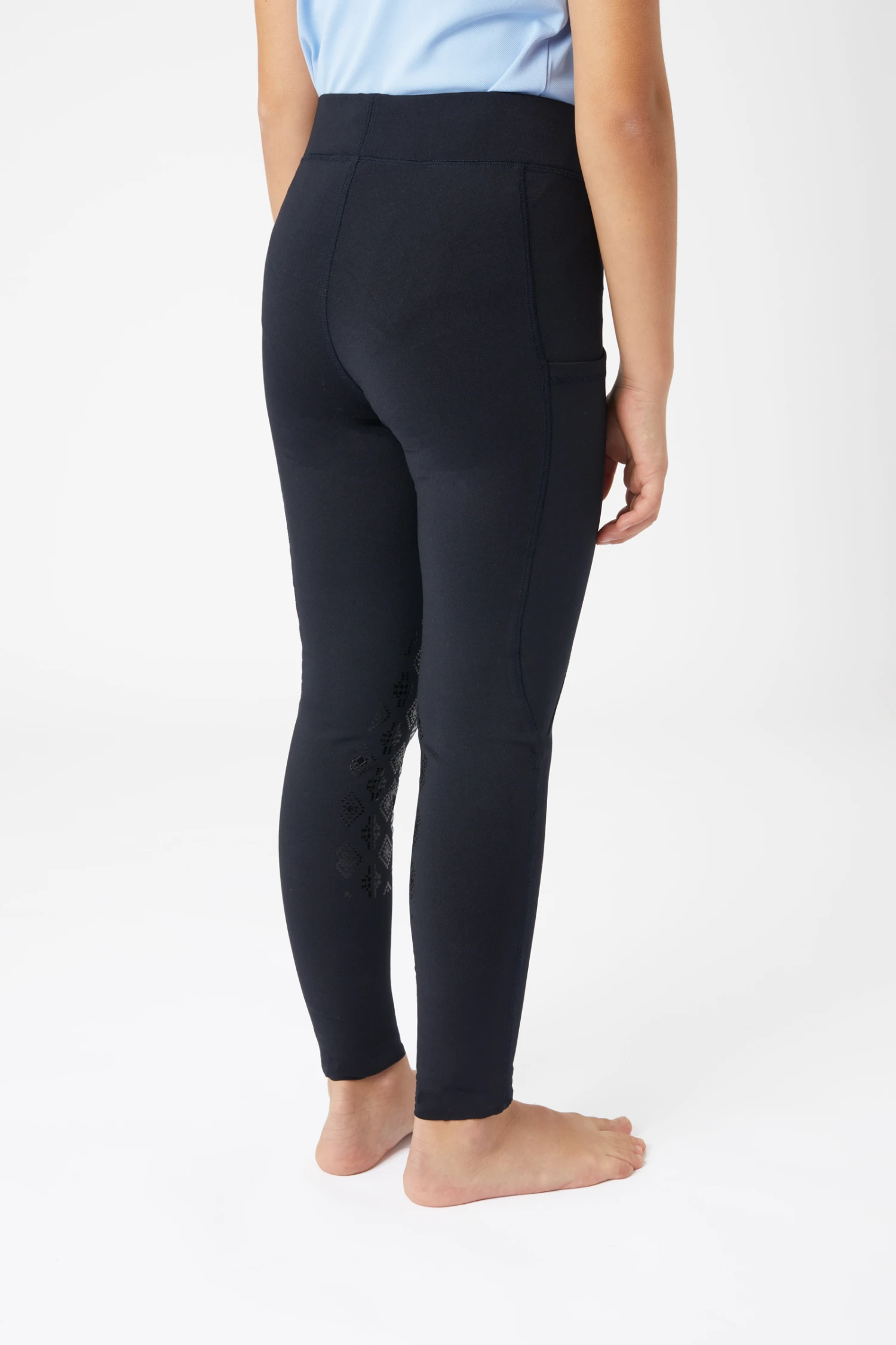 Eine klassische Kinder-Reitleggings aus weichem, dehnbarem Stoff für hohen Tragekomfort. Der Kniegrip ist mit einem zarten Aztekenmuster bedruckt. Am linken Oberschenkel bietet eine große Tasche Platz für das Handy deines Kindes. Ein kleiner Logo-Metallanhänger befindet sich auf der linken Vorderseite unterhalb des Bunds.